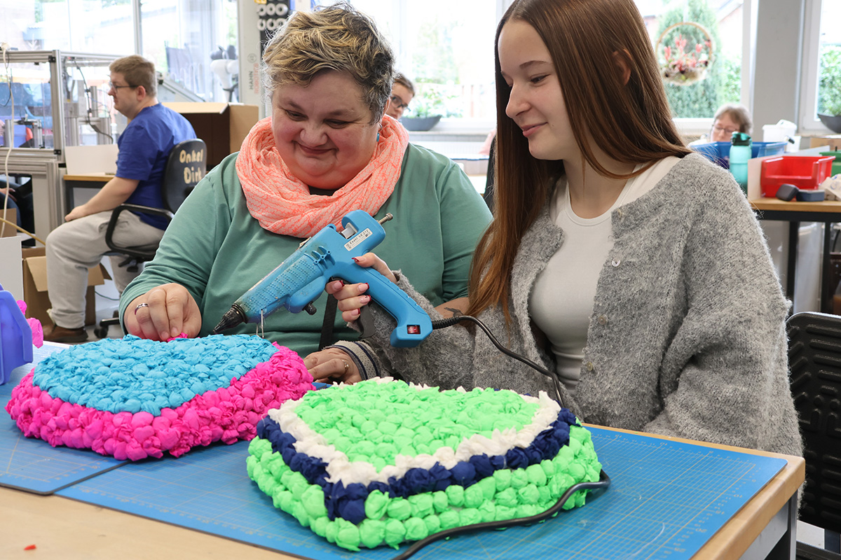 Besonders prägend sind für beide die zwischenmenschlichen Begegnungen. „Ein Moment, der mir im Kopf geblieben ist, war, als mir jemand aus der Gruppe gesagt hat, dass er mich mag“, berichtet Jill. „Das hat mich richtig berührt.“ Teilhabe am Arbeitsleben heißt vor allem, den Gruppenalltag gemeinsam zu gestalten. Dabei geht es nicht nur um die Arbeit: Gemeinsam mit Paula, Mitarbeiterin der Gruppe, hat Jill einen Kuchen für die Kollegen gebacken: „Das hat richtig Spaß gemacht!“