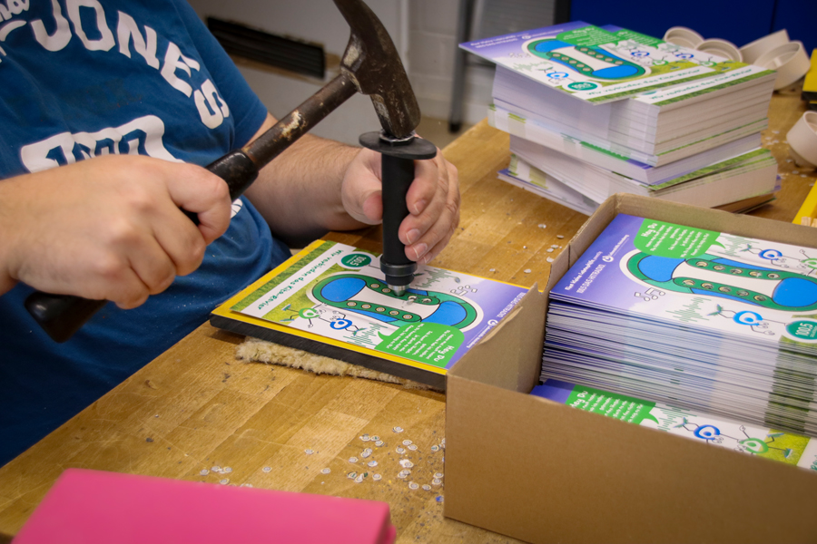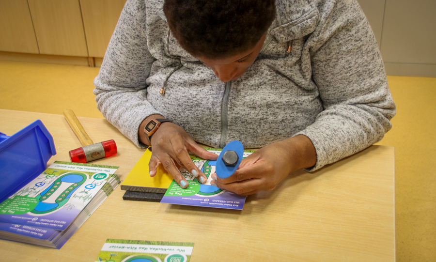 Im Förderbereich der Werkstätten der Lebenshilfe Heinsberg arbeiten rund 260 Menschen mit komplexer Behinderung. In den Fördergruppen mit dem Schwerpunkt „Herausforderndes Verhalten“ am Standort Betrieb 2 in Oberbruch entstand eine besondere Idee: eine handgebundene Lernkarte, mit der Kinder spielerisch das Schleifenbinden lernen.